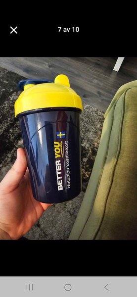 Shaker från Better You i blått och gult. Perfekt för att blanda kosttillskott eller proteinpulver.