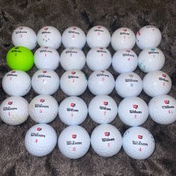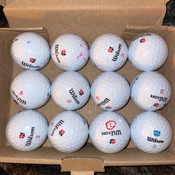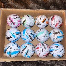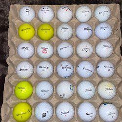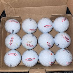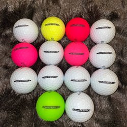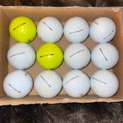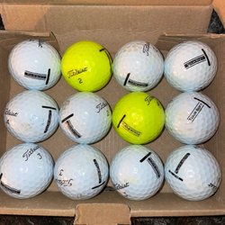 Ett dussin golfbollar av märket Titleist Pro V1. Inkluderar en gul boll.