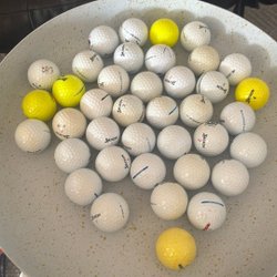 En samling golfbollar från olika märken som Wilson, Callaway, TaylorMade och titleist. Blandade färger och modeller.