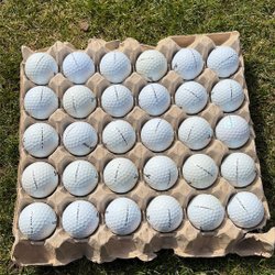 30 stycken golfbollar av olika märken och modeller. Bollarna är av varierande typ och kan användas för träning eller spel.