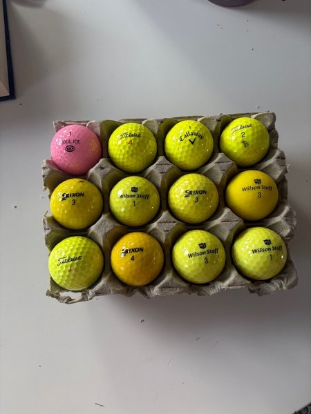 Ett dussin golfbollar med blandade märken. Innehåller bollar från Titleist, Callaway, Srixon, Wilson Staff och Cool Ice.