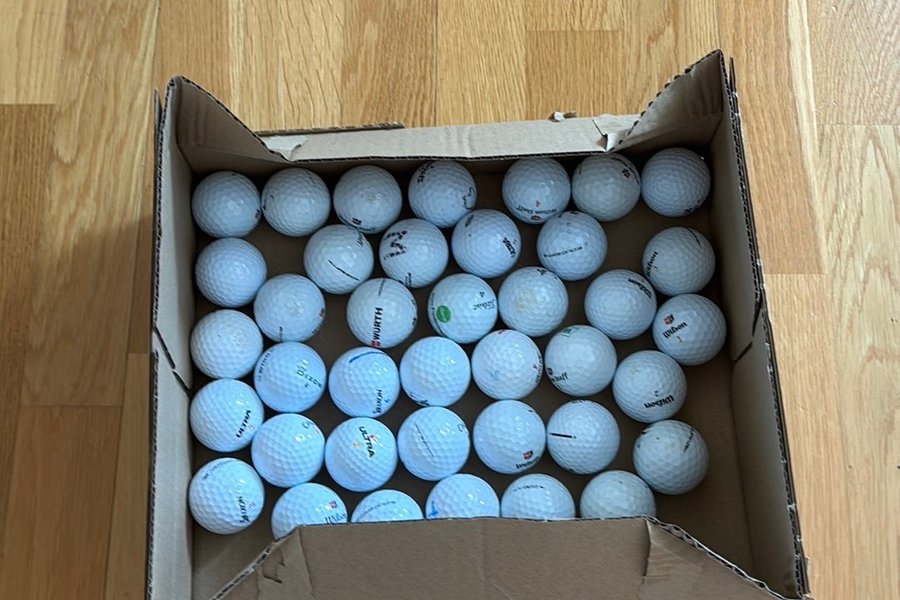 En låda med 40 Floridabollar, vissa bollar är i gott skick medans vissa är i okej skick.