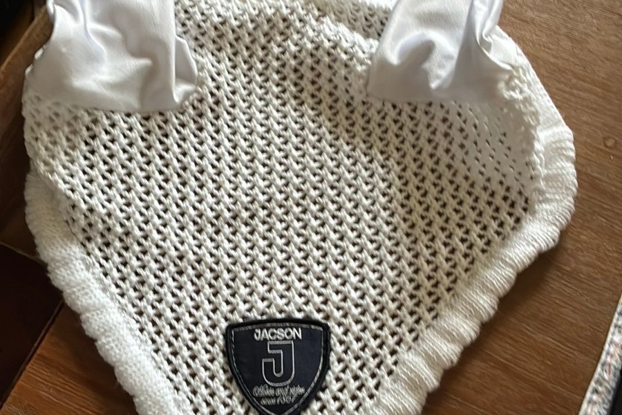 Jacson flughuva i vitt med Jacson-logotypen broderad på framsidan. Huvan är designad för att skydda hästen från insekter.