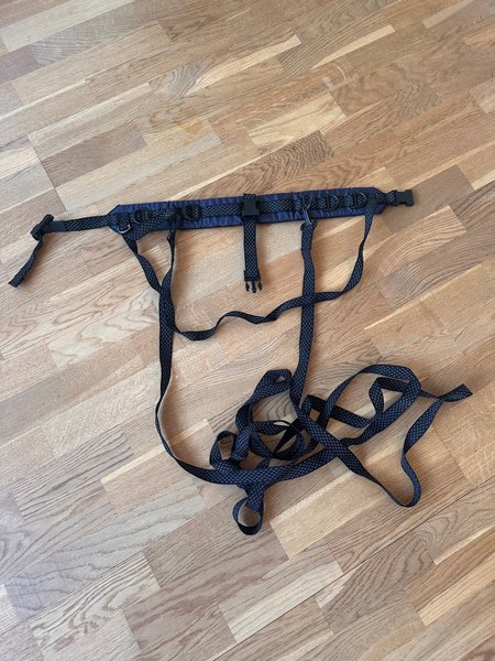 Vadderad skidsele för att lära barn åka skidor. Fästes runt midjan och benen på barnet. Linan kan fästas vid olika punkter på selen för varierande rörelsefrihet/svårighetsgrad.
