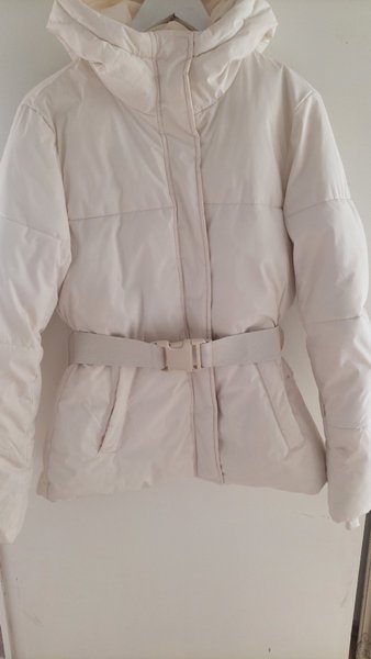 Vit pufferjacka/skid jacka med huva och ett avtagbart bälte i midjan från Lager 157. Jackan har en dragkedja framtill och fickor i sidorna