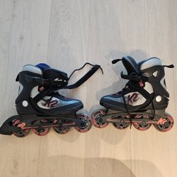 Ett par Reebok inlineskates i storlek 2. Perfekt för barn som vill lära sig åka eller för den som behöver ett par mindre skridskor. Sulorna bytta till passande bauer. Innermått ca 21,7 cm.