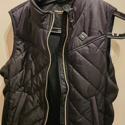 Svart väst med vadderade axlar och justerbara remmar framtill och vid axlarna.
