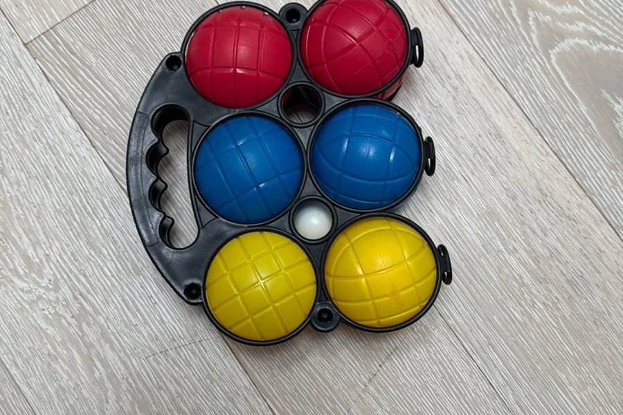 Bocciaspel med sex klot i färgerna rött, blått och gult samt en vit "lille". Kloten förvaras i en praktisk svart hållare med handtag.