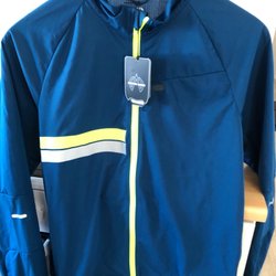 Jacka med dragkedja framtill och hög krage. Jackan har långa ärmar med muddar och reflekterande detaljer. Baksidan har ett ventilerande parti med små perforeringar.