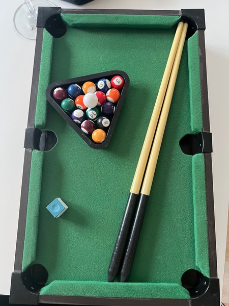 Minibiljardbord med tillbehör. Inkluderar biljardbollar, två köer och en triangel.