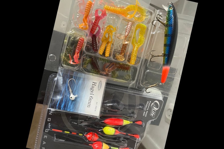 Innehåller ett urval av fiskedrag och tillbehör, inklusive olika typer av beten och flöten. Passar för olika fiskeformer.