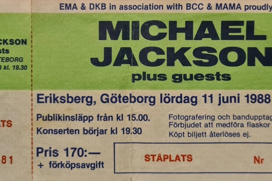 1 st. oanvänd Biljett till Michael Jacksons hyllade konsert på Eriksberg, Göteborg lördag 11 juni 1988 kl 19.30. Ståplats.
