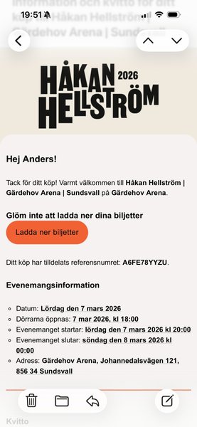 Vi säjer två biljetter till Håkan Hellström i Sundsvall 7 mars 750 kr st