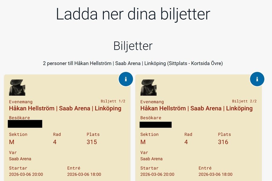 Säljer två biljetter till Håkan Hellströms spelning i SAAB Arena idag 6/3 kl 20:00 pga. sjukdom.