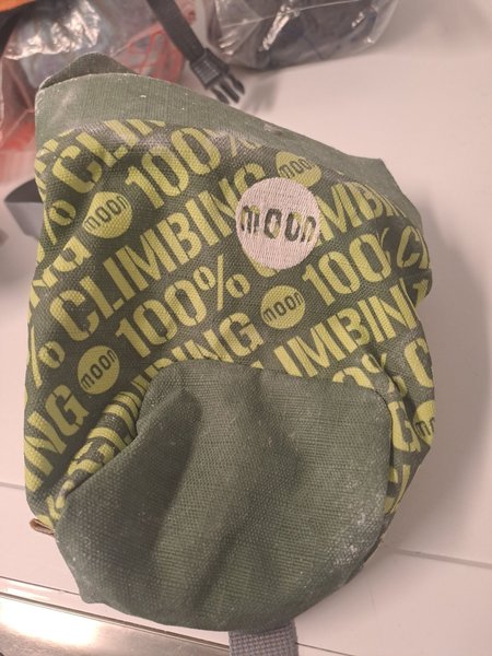 Klätterpåse från Moon. Grön med texten "100% CLIMBING" i ljusgrönt och Moon-logotypen.