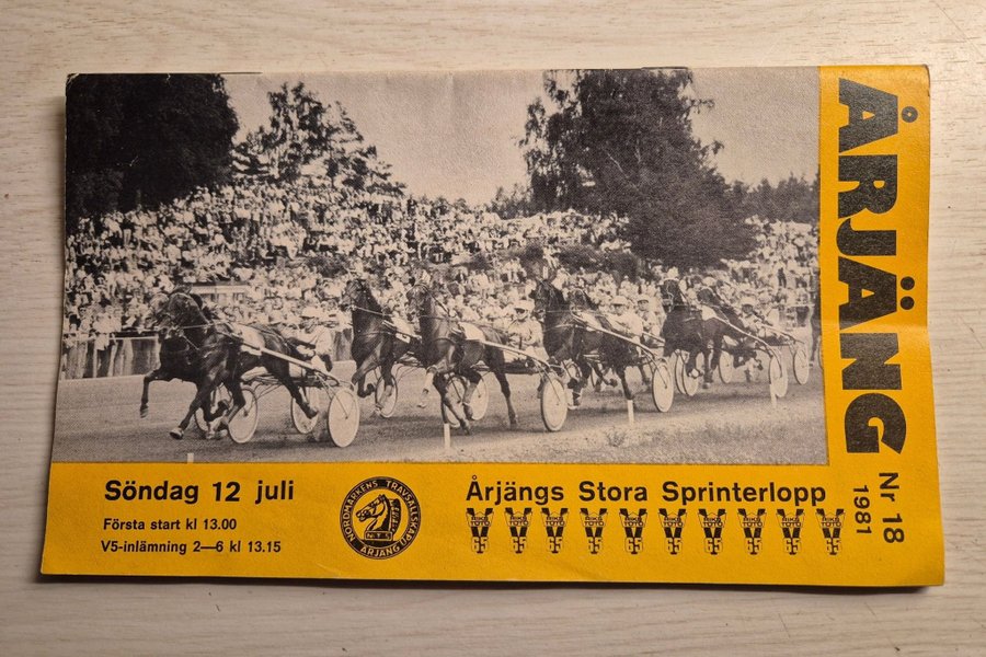Travprogram från Årjängs Stora Sprinterlopp, söndag 12 juli 1981. Första start klockan 13.00. V5-inlämning 2-6 klockan 13.15. Programmet är nummer 18.