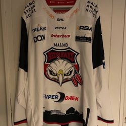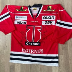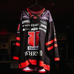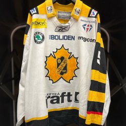 Blå hockeytröja med orange och vita detaljer. Tröjan har texten "??????" och nummer 10 på ryggen.