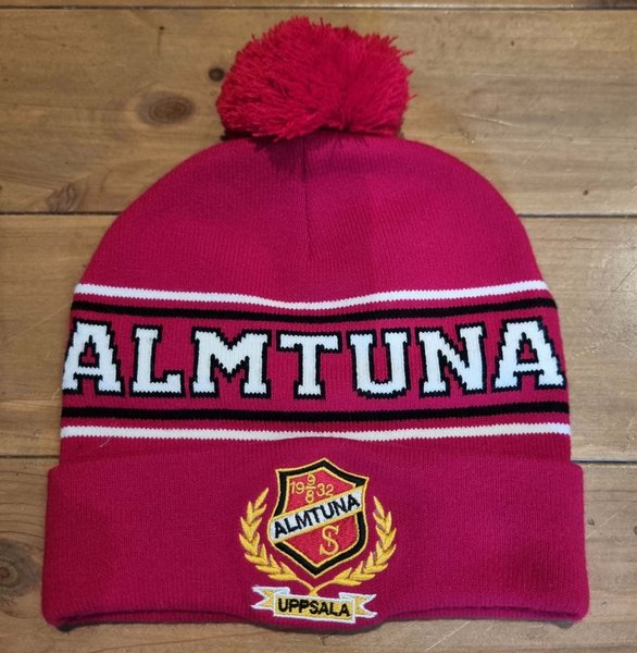 Mössa i rött med texten "ALMTUNA" i vitt och svart. Mössan har en tofs upptill och ett broderat emblem med texten "ALMTUNA S 1932 UPPSALA" omgivet av lagerblad.