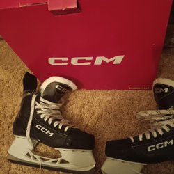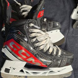 Ett par svarta skridskor med röda detaljer från CCM. Modellen heter Jetspeed FT670 och är i storlek US 3 (36).