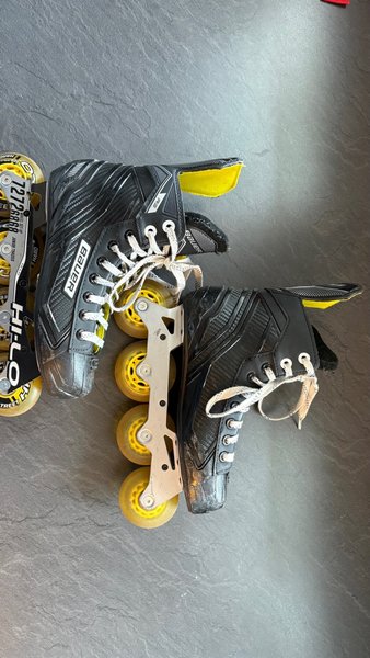 Bauer RS inlineskridskor med Hi-Lo chassi och gula hjul. Skridskorna är svarta med vita skosnören.