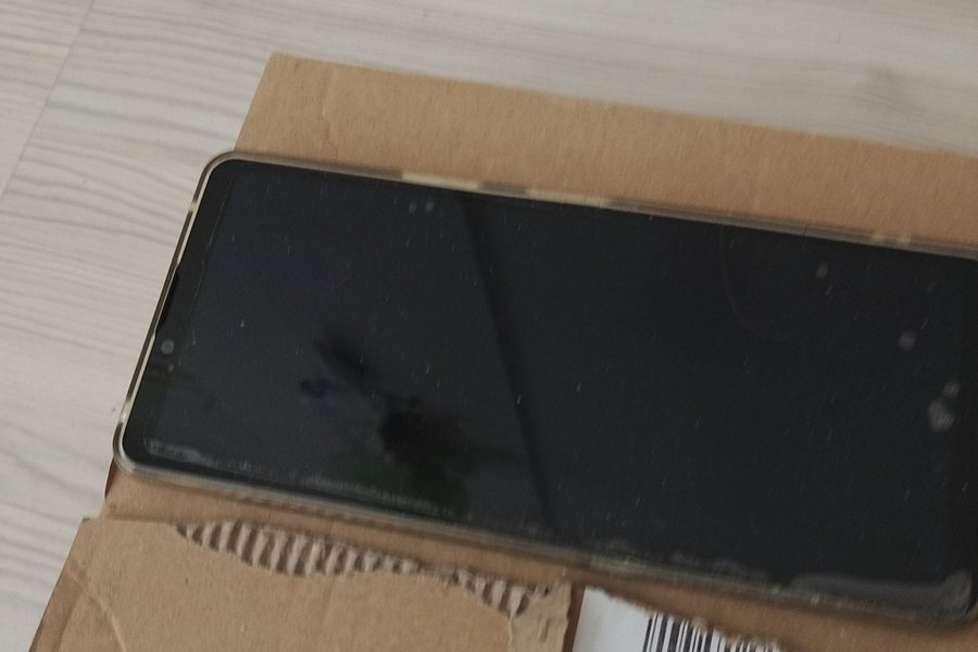 En smartphone med en svart skärm. Telefonen ligger på en bit kartong.
