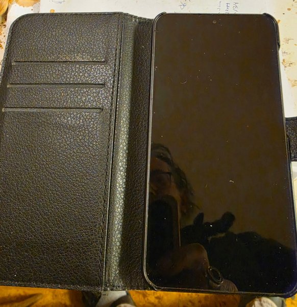 Svart mobiltelefonfodral i läder med plats för kort. Fodralet är designat för att skydda din telefon och har en praktisk plånboksfunktion.