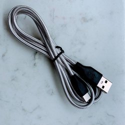 USB-C kabel för laddning och dataöverföring. Silverfärgad med flätad design.