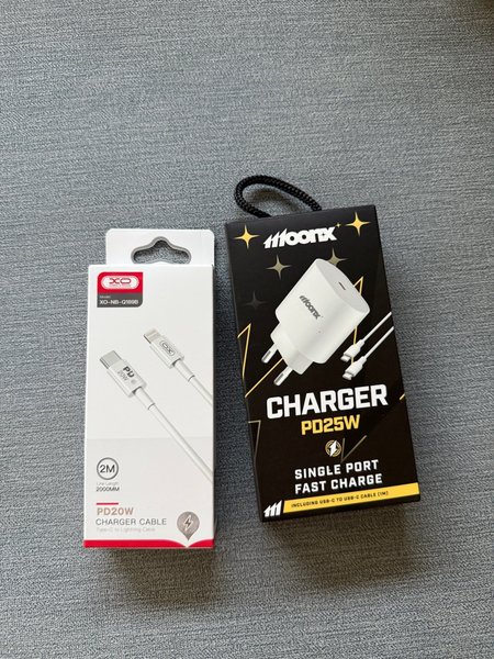 Säljer en XO-NB-Q189B PD20W laddarkabel (Type-C till Lightning) med en kabellängd på 2 meter. Inkluderar även en Moonx PD25W laddare med en USB-C till USB-C kabel (1 meter).