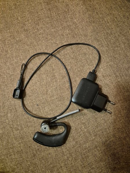 Plantronics Bluetooth-headset med tillhörande laddare. Headsetet är svart och har en öronkrokdesign. Orginal USB kabel&Laddare.