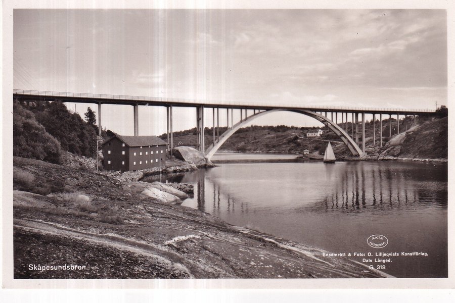 Svartvitt fotografi föreställande Skåpesundsbron. Bilden visar bron som sträcker sig över vattnet, med en byggnad vid strandkanten och en segelbåt i vattnet. Fotot är märkt med "AKTA FOTOGRAFI" och "Ensamrätt & Foto: O. Lilljeqvists Konstförlag, Dals Långed. G 318".