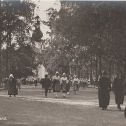 Ett vykort som visar en grupp människor i folkdräkter i Leksand. Vykortet är från Axel Eliassons Konstförlag, Stockholm No. 2171.