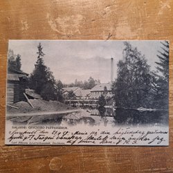 Vykort med motiv av Grycksbo. Föreställer en fors med byggnader i bakgrunden. Baksidan har en stämpel och handskriven text.