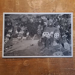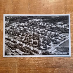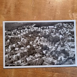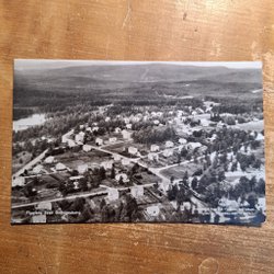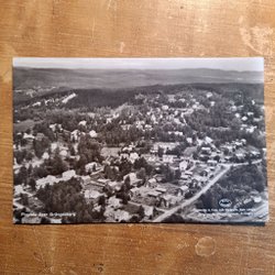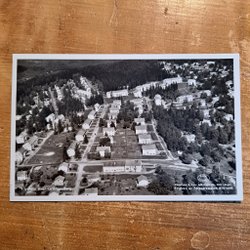 Ett svartvitt flygfoto över Grängesberg. Foto Aero Materiel A.B H 3106. Förlag: Elfwing:s Eftr. Pappershandel, Grängesberg. Svensk tillverkning. Numrerad 42012.