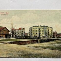 Vykort med motiv av ett landskap med vatten och byggnader. Kortet är poststämplat och har text på baksidan