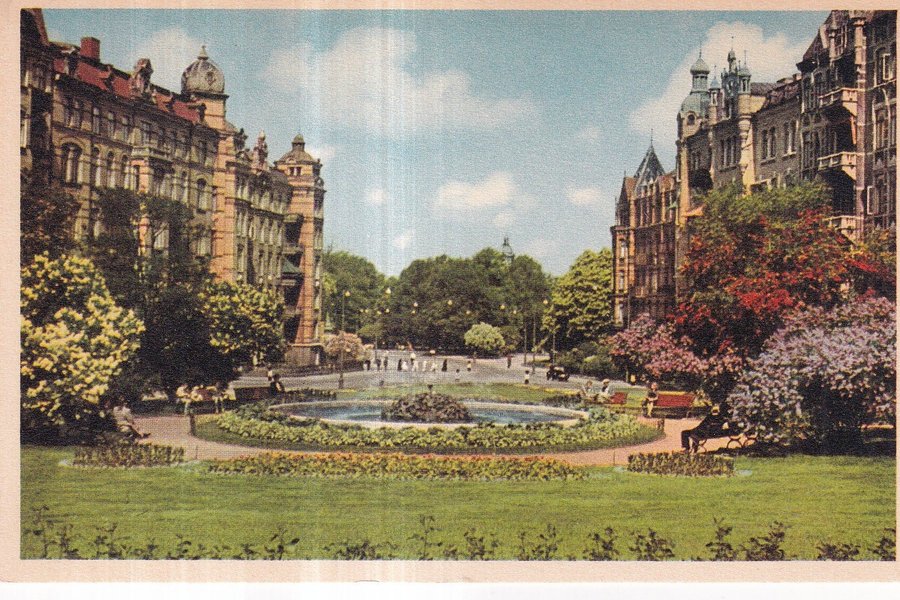 . Kortet visar en park med en fontän i förgrunden och byggnader i bakgrunden. Träd och buskar med blommor ramar in motivet.