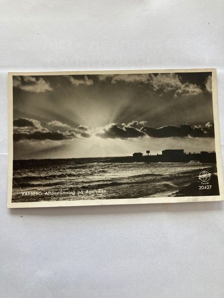 Ett svartvitt vykort föreställande Varberg, med en stämningsfull bild av Apelviken.