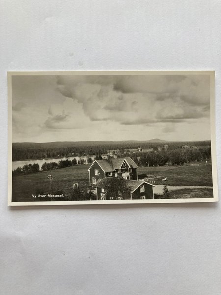 Ett svartvitt vykort som visar en vy över Moskosel.