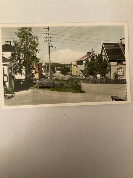 Ett vykort med ett motiv av en gata med hus.