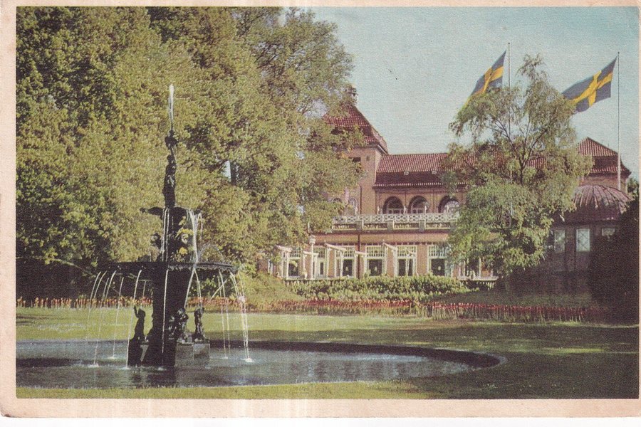 Vykort med motiv av en fontän i förgrunden och en stor byggnad med två svenska flaggor i bakgrunden. Runt fontänen finns gräs och blomsterrabatter. Byggnaden har flera fönster och en röd takfärg.