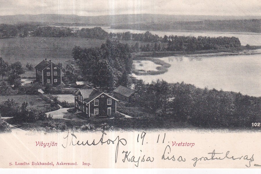 Vykort med motiv av Vibysjön och Vretstorp. Kortet är poststämplat 19.11. Texten "Kajsa Lisa gratuleras" är skriven på kortet. Förlaget är S. Lundhs Bokhandel, Askersund.