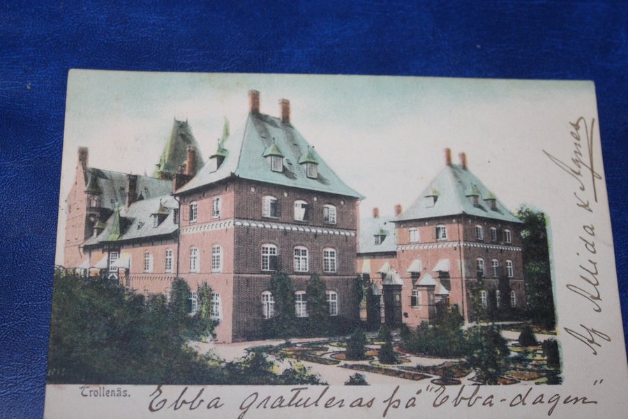 Ett vykort med motiv av Trollenäs slott. På kortet står det "Ebba gratuleras på Ebba-dagen med märke".