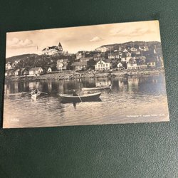 Ett vykort med ett motiv av en stad vid vattnet. Vykortet visar byggnader, båtar och flaggor.