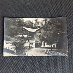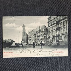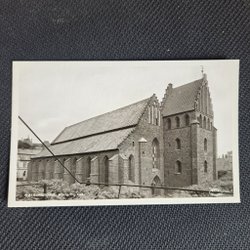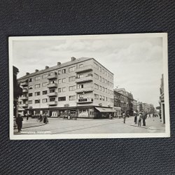 Svartvitt vykort föreställande Helsingborg Vikingstrand. På baksidan finns handskriven text, frimärken och stämpel.