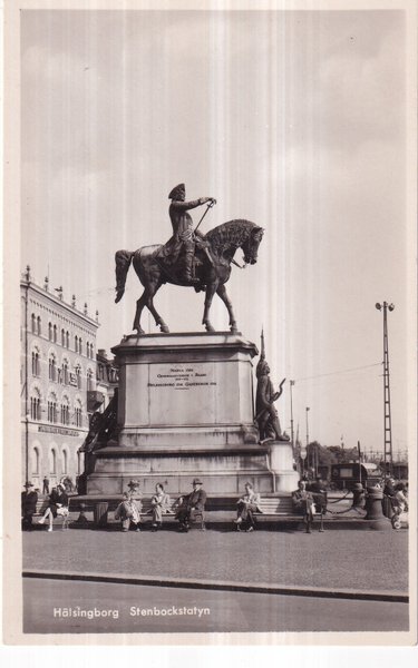 Svartvitt fotografi föreställande Stenbockstatyn i Helsingborg. Statyn visar en man till häst på ett högt fundament. Runt statyn sitter flera personer på bänkar. I bakgrunden syns byggnader och en stolpe.