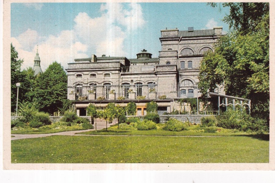 Vykort med motiv av en stor byggnad omgiven av träd och en grön gräsmatta i förgrunden. Byggnaden har flera fönster och balkonger. En spira syns i bakgrunden.