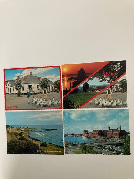 Vykort med motiv från Skåne. Korten visar olika platser och scener från regionen, inklusive Skanör, Smygehuk och Malmö. Ett av korten har en bild av gäss som går på en väg.