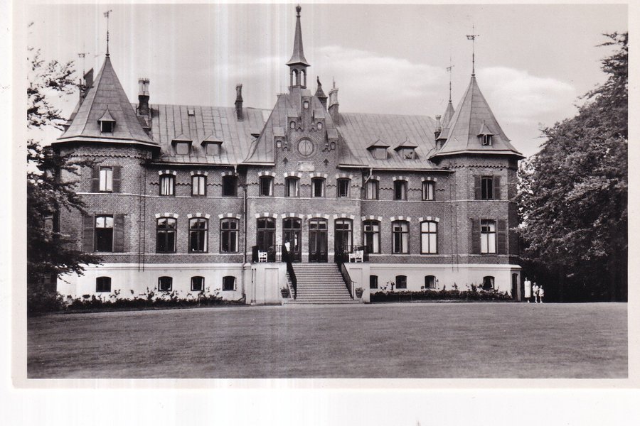 Svartvitt fotografi föreställande en stor herrgård med flera torn och en bred trappa som leder upp till huvudentrén. Herrgården är omgiven av en gräsmatta och träd.