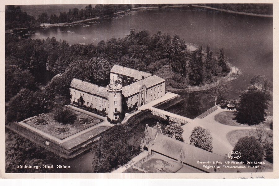 Flygfoto över Söfdeborgs Slott i Skåne. Bilden är märkt med "AKTA FOTOGRAFI" och texten "Ensamrätt & Foto: A/B Flygtrafik, Dals Långed, Frigiven av Försvarsstaben H 487".