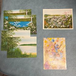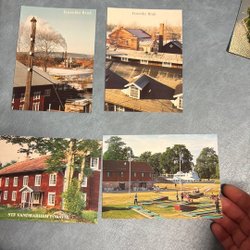 Tre tryck med motiv från Lessebo Bruk. Tryckt på handgjorda kort. Motiv Åkerby vägskäl med utvandrarstenen, Arbetsmoment vid handpapperstillverkning samt bruket.