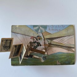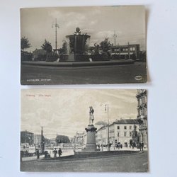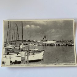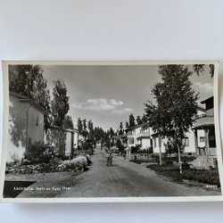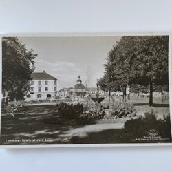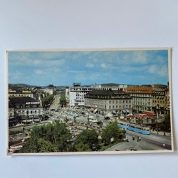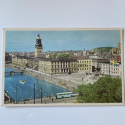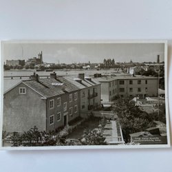 Vykort med en stadsvy över bebyggelse och vatten i bakgrunden. Kortet har en detaljerad bild av staden sedd från höjd.